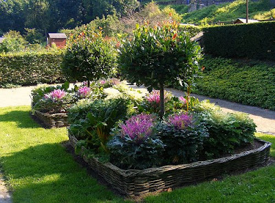 Last year the gardens next to the castle ramparts in Fougeres had a make over. I watched two people weaving low fences around the gardens, it looked quite hard work. This week in the park I visited I saw this lovely basketry around a fun garden which had pretty cabbage plants in it.